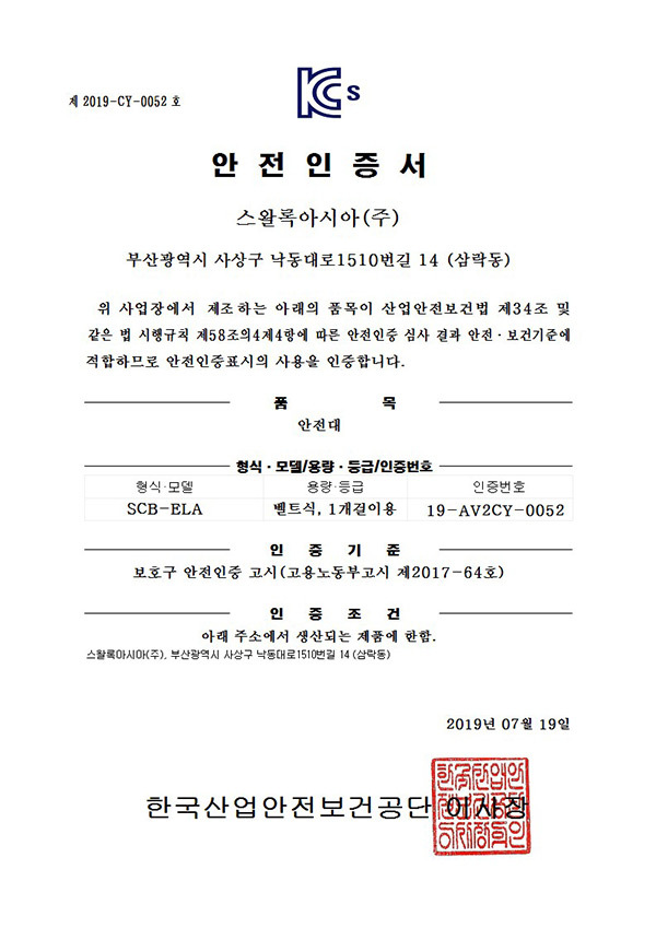 유니칸 안전벨트 UK-B01, UK-B02 인증서