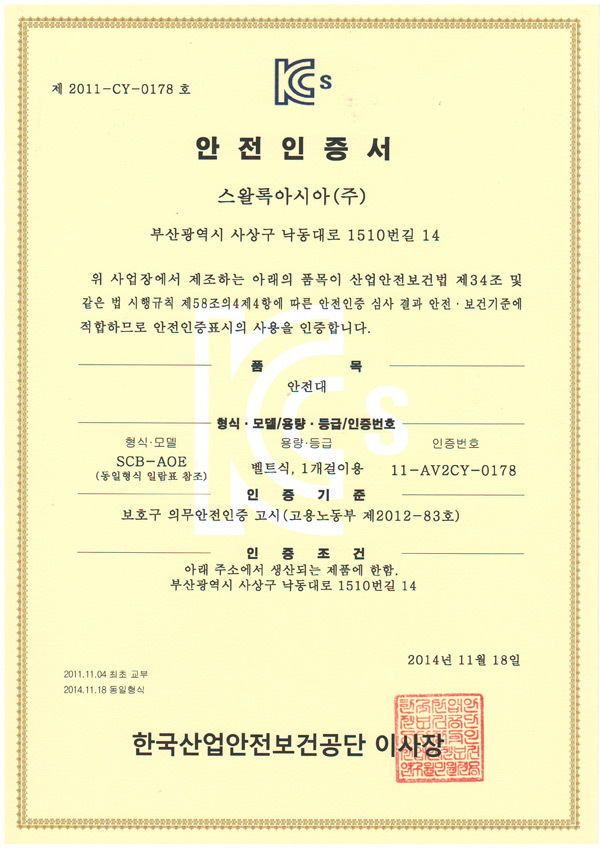 블랙야크 안전벨트 YB-2001, YB-2002 인증서