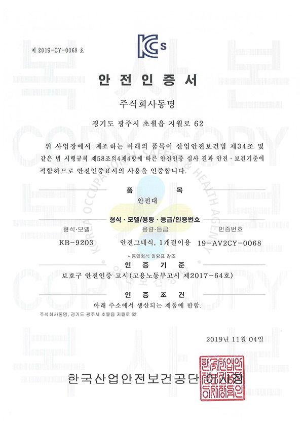 K2 안전벨트 KB-9203, KB-9203(Y 인증서
