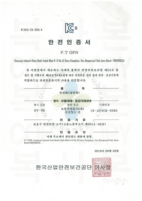 K2 안전화 KV-81 인증서