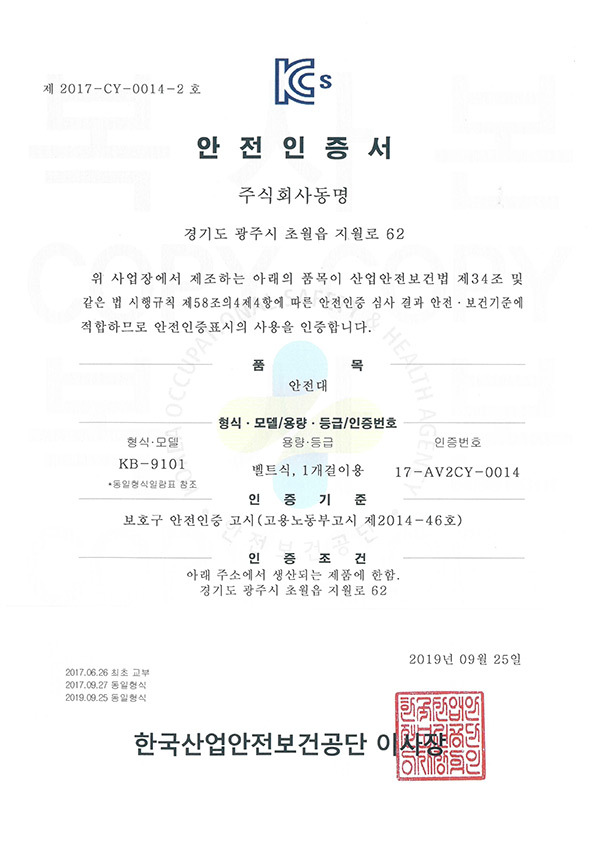 K2 안전벨트 KB-9101, KB-9102 인증서