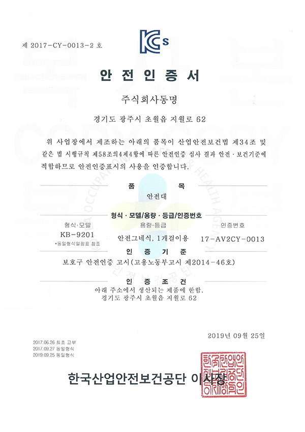 K2 안전벨트 KB-9201, KB-9201(Y), KB-9202 인증서
