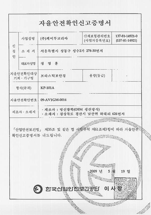 K2 안전벨트 KB-9201, KB-9201(Y), KB-9202 인증서