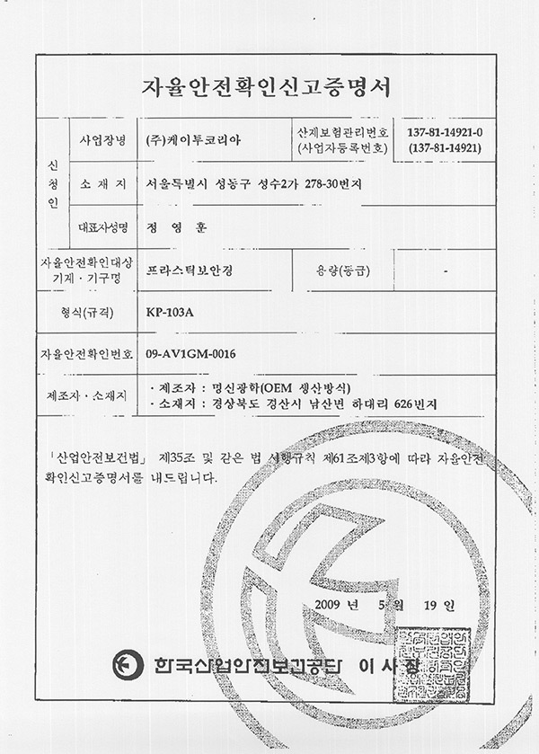 K2 보안경 KP-103A 인증서