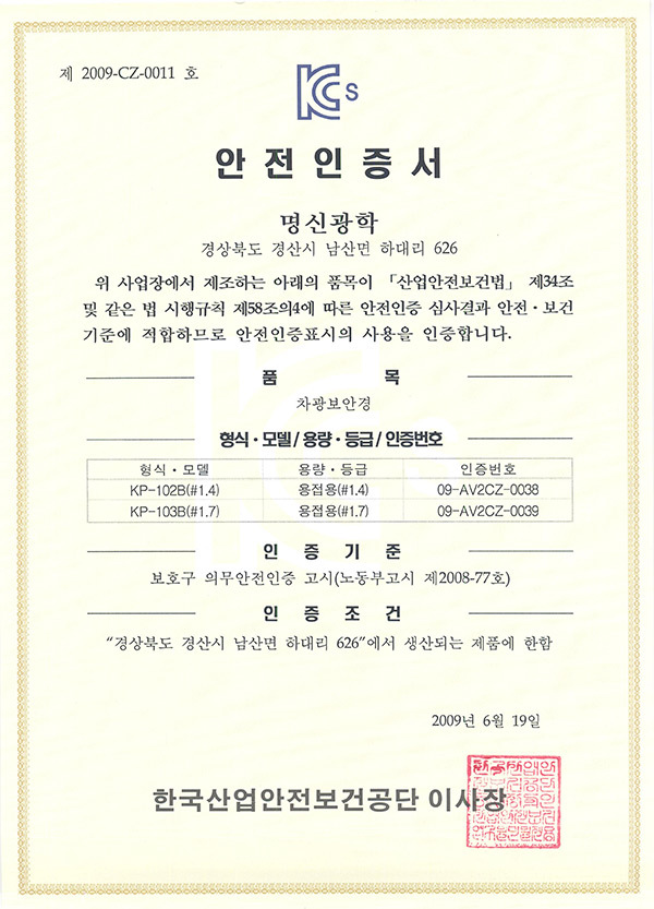 K2 보안경 KP-103B 인증서