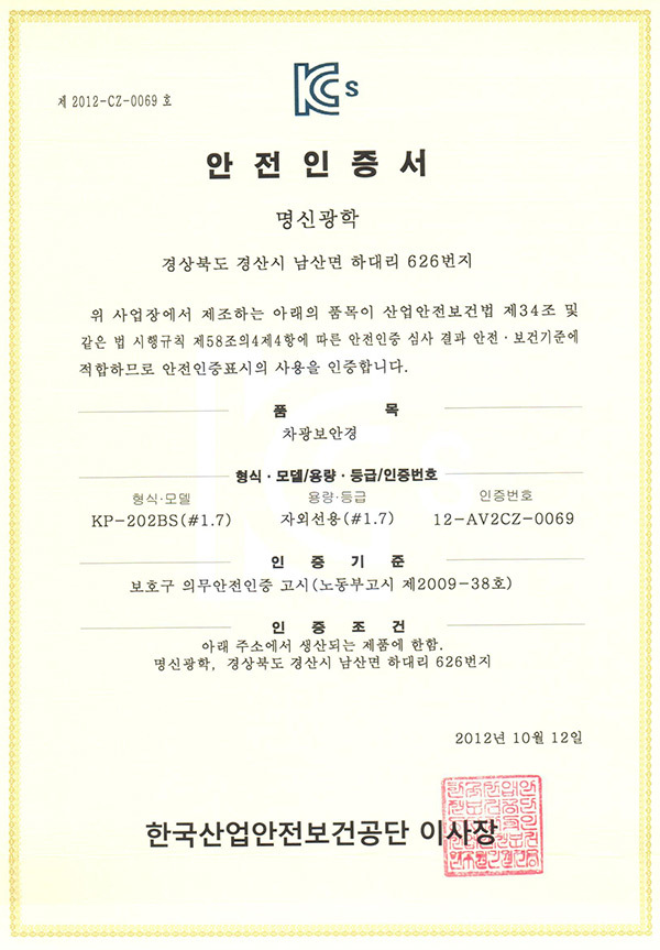K2 보안경 KP-105B 인증서