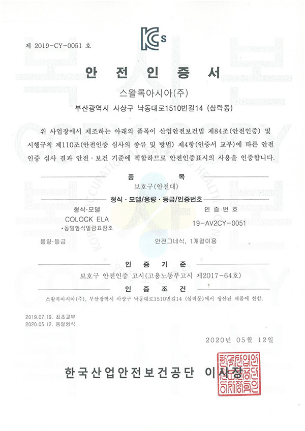 유니칸 안전벨트 UK-B01, UK-B02 인증서